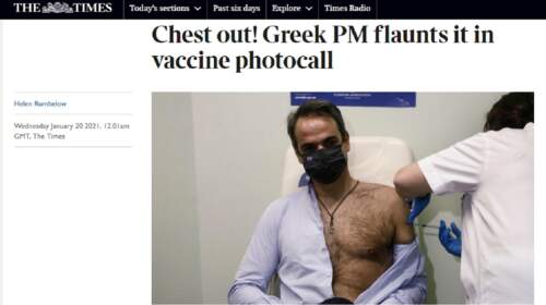 Τα διεθνή μέσα έχουν πάρει – κυριολεκτικά- στο ψιλό τον Κυριάκο Μητσοτάκη για τις… ημίγυμνες πόζες του κατά τον εμβολιασμό. Μετά τη δημοσιογράφο του CNN, Κριστιάν Αμανπούρ (δείτε: «Κοίτα να δεις πόζα…»: Δημοσιογράφος του Cnn «τρολάρει» τον εμβολιασμό του ανέμελου Μητσοτάκη) σειρά πήραν οι Times. Με το στήθος έξω! Φωτογραφίζεται και το επιδεικνύει κάνοντας το εμβόλιο! “Ο Έλληνας Πρωθυπουργός «κορδώνεται»…