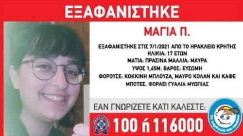 Αίσιο τέλος είχε η εξαφάνιση της 17χρονης Μάγιας, που είχε χαθεί από το κέντρο του στις 7 Ιανουαρίου. Πριν λίγο ενημερώθηκε ο πατέρας της από την αστυνομία ότι η κόρη του είναι καλά και βρέθηκε σε περιοχή του δήμου Αρχανών Αστερουσίων. Η ανήλικη είχε εξαφανιστεί στις 7/1/2021 και ώρα 15:30 από το κέντρο του Ηρακλείου. Αμέσως κινήθηκε η διαδικασία και…