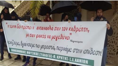 Πραγματοποιήθηκε το μεσημέρι της Πέμπτης συγκέντρωση διαμαρτυρίας στην Περιφέρεια Χανίων από μέλη του Πανελλήνιου Μουσικού Συλλόγου παραρτήματος Χανίων. Η κινητοποίηση έγινε με αφορμή τα έκτακτα μέτρα που πλήττουν και πάλι τον μουσικό κλάδο. Επιδόθηκε στην Περιφέρεια ψήφισμα/διαμαρτυρία του ΔΣ του παραρτήματος Χανίων Πανελλήνιου Μουσικού Συλλόγου. Μεταξύ των άλλων πάγιων αιτημάτων, δόθηκε ιδιαίτερη έμφαση στην οικονομική στήριξη του μουσικού κλάδου άμεσα…
