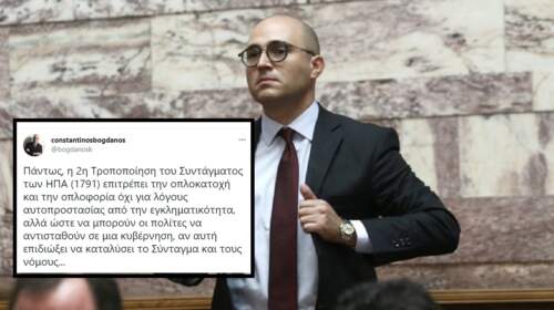 Την αντίληψη των ακροδεξιών της Αμερικής περί ελεύθερης οπλοκατοχής και οπλοφορίας, υποστηρίζει μέσω των social media ο βουλευτής της ΝΔ, Κώστας Μπογδάνος! Δείτε την ανάρτησή του και την απάντηση του δημοσιογράφου Σεραφείμ Κοτρώτσου