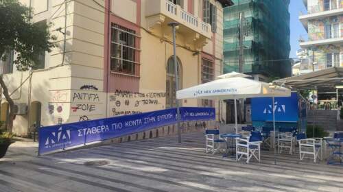Με ένα πανό κάλυψε όλη τη μπάρα μετακίνησης ανθρώπων και κινητικά προβλήματα στην πίσω είσοδο του κτιρίου της περιφέρειας Κρήτης, διακηρύσσοντας μάλιστα ότι είναι “σταθερά πιο κοντά στην Ευρώπη”! Σίγουρα η εικόνα αυτή πάντως δε δείχνει και τόσο ευρωπαϊκή, αν το καταλαβαίνουν εκεί στη ΝΔ… Δεν έφτανε το “πλατειάκι” που καταλήφθηκε, έπρεπε να ντυθεί στα γαλάζια και η μπάρα;