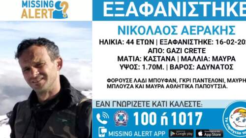 Μεγάλη είναι η αγωνία για τους συγγενείς του 44χρονου Νίκου Αεράκη από το Ηράκλειο, τα ίχνη του οποίου χάθηκαν μετά από ένα τροχαίο ατύχημα. Δείτε: Ηράκλειο: Συναγερμός για την εξαφάνιση 44χρονου – Έρευνες στην περιοχή του Παλαιόκαστρου Άφαντος ο 44χρονος από το Γάζι – Αγνοείται από την Πέμπτη, μετά την εμπλοκή του σε ατύχημα Missing Alert για τον 44χρονο αγνοούμενο…