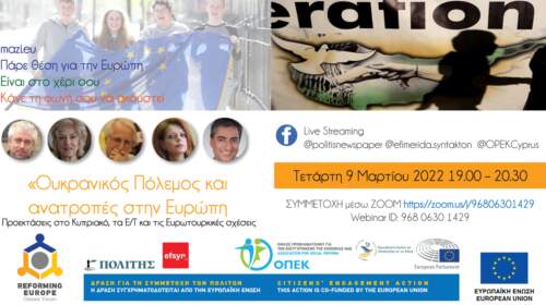 Οι δραματικές εξελίξεις στην Ουκρανία και οι ανατροπές που έφερε στην ασφάλεια και την σταθερότητα στην Ευρώπη βρίσκονται στο επίκεντρο της διαδικτυακής εκδήλωσης που οργανώνουν ο Όμιλος Προβληματισμού για τον Εκσυγχρονισμό της Κοινωνίας μας – ΟΠΕΚ και η Πρωτοβουλία για την Ειρήνη και την Αλληλεγγύη με την Κύπρο – Έτος Κύπρου. Η συζήτηση, που θα γίνει (αύριο) Τετάρτη, 9 Μαρτίου…