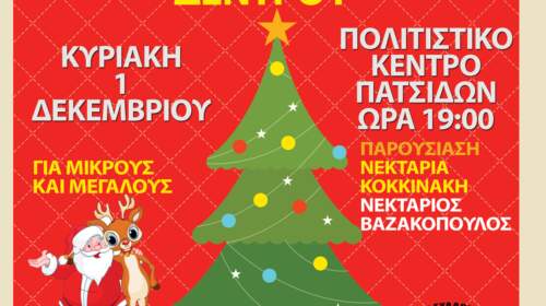 Ο Πολιτιστικός Σύλλογος Πατσίδων σας προσκαλεί στην έναρξη των Χριστουγεννιάτικων εκδηλώσεων στις Πατσίδες! Την Κυριακή 1 Δεκεμβρίου στις 19.00 η Φωταγώγηση του Χριστουγεννιάτικου Δέντρου στο Πολιτιστικό Κέντρο Πατσίδων!! Υποδεχόμαστε από τις 18.30 τον Άγιο Βασίλη με το έλκηθρο και τα Ξωτικά του,τους Ήρωες της Ντίσνευ, τον Όλαφ τον χιονάνθρωπο από την Frozen , την Χριστουγεννιάτικη Μίνι με τον Μίκυ, την Μλούι το…