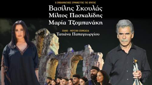 Με την υποστήριξη της Περιφέρειας Κρήτης Με την υποστήριξη της Περιφέρειας Κρήτης πραγματοποιείται μια μουσική διαδρομή με αφετηρία την αρχέγονη, βυζαντινοπρεπή μουσική της Κρήτης και την αποτύπωση της στο σήμερα στο Ωδείο Ηρώδου Αττικού την Τετάρτη 13 Οκτωβρίου 2021 και ώρα 8.30 μ.μ.  Με αρχή το Ριζίτικο τραγούδι, μνημείο της Κρητικής μουσικής που έχει τις ρίζες του στα βυζαντινά χρόνια,…