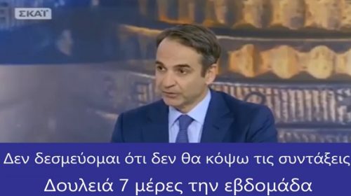 Σήμερα προσπαθεί να κάνει πιο «στρογγυλές» τις αληθινές του θέσεις, για να μην τρομάξει τον κόσμο που τον βλέπει σαν… «σωτήρα», εκείνον τον κόσμο που παρακολουθεί ΣΚΑΪ και τα μέσα του υπόδικου Μαρινάκη. Ας θυμηθούμε όμως, σε ένα βίντεο, σε τί πραγματικά έχει δεσμευτεί ο Κυριάκος Μητσοτάκης όλα αυτά τα χρόνια και τί πραγματικά θα εφαρμόσει αν κατάφερνε να εκλεγεί…