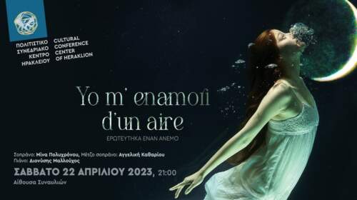Σάββατο 22 Απριλίου, στις 21:00, στην Αίθουσα Συναυλιών Το ΠΣΚΗ παρουσιάζει τη μουσική παράσταση Yo m’ enamori d’ un aire – Ερωτεύτηκα έναν άνεμο. Άνεμος, έρωτας, πνοή, αγάπη, πάθος, «φωνή αύρας λεπτής»…δύο λυρικές φωνές και ένας πιανίστας αλληλοαποκαλύπτουν θραύσματα, συνενώνουν νήματα, υφαίνουν στολίδια μελωδίας και λόγου σε ένα μουσικό καλειδοσκόπιο στο οποίο άριες και ντουέττι από όπερες συνομιλούν με την Ελληνική…