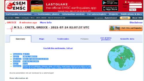 Νέος σεισμός μεγέθους 5,1 Ρίχτερ έγινε αισθητός στην περιοχή του Ηρακλείου στις 5:08 το πρωί του Σαββάτου. Ο σεισμός είχε επίκεντρο την ίδια περιοχή κοντά στο Αρκαλοχώρι. Magnitude mb 5.1 Region CRETE, GREECE Date time 2021-07-24 02:07:37.4 UTC Location 35.16 N ; 25.24 E Depth 0 km Distances 21 km SE of Irákleion, Greece / pop: 137,000 / local time:…