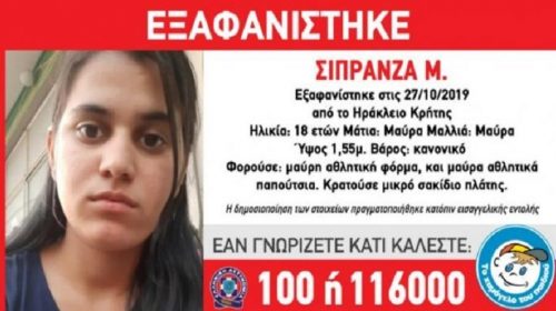 Έληξε η περιπέτεια της Σιπράνζα Μ., 18 ετών, δίνοντας τέλος στην αγωνία των δικών της ανθρώπων που την αναζητούσαν. Η Σιπράνζα Μ. εντοπίστηκε στις 2/1/2020 από τους οικείους της. «Το Χαμόγελο του Παιδιού» ενημερώθηκε σήμερα 5/2/2020 για την εύρεση της Σιπράνζα Μ. και άμεσα προχώρησε στην λήξη της δημοσιοποίησης των στοιχείων. Η 18χρονη είχε εξαφανιστεί στις 27/10/2019 και ώρα 18:00,…