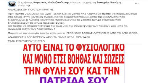 Ενάντια στο αυτοοργανωμένο Pride Χανιών Ο υποψήφιος με το ακροδεξιό μόρφωμα «Σπαρτιάτες» στην εκλογική περιφέρεια Νομού Ρεθύμνης, Κυριάκος Μπλαζουδάκης, διαφημίζει ομοφοβική αντιδιαδήλωση ενάντια στο αυτοοργανωμένο Pride Χανιών, μέσω της σελίδας του στα μέσα κοινωνικής δικτύωσης. Ο υποψήφιος με τους «Σπαρτιάτες» ανέβασε στη σελίδα του στο Facebook «ανακοίνωση πολιτών Κρήτης», που καλεί σε αντιδιαδήλωση ενάντια στην 1η Πορεία Ορατότητας ΛΟΑΤΚΙ+ Κοινότητας…