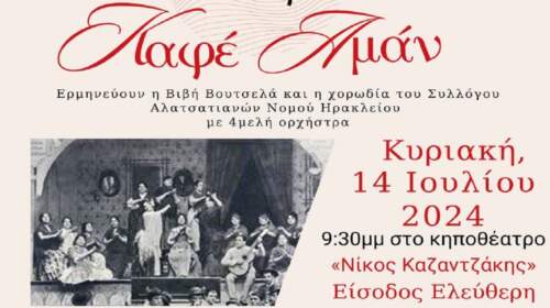 Ο σύλλογος Αλατσατιανών Ηρακλείου με την στήριξη της Περιφέρειας Κρήτης και του Δήμου Ηρακλείου θα παρουσιάσει την Κυριακή, 14 Ιουλίου 2024, στις 9:30µµ στο κηποθέατρο «Νίκος Καζαντζάκης», την ετήσια µουσικοχορευτική εκδήλωση του, µε τίτλο «Στα Χνάρια του Καφέ Αµάν». Ένα µουσικοχορευτικό πρόγραµµα αφιερωµένο στα Καφέ Αµάν της Σµύρνης µε τραγούδια και µελωδίες από τις αρχές του 19ου αιώνα µέχρι και…