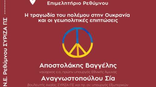 Με τον Βαγγέλη Αποστολάκη, την Σία Αναγνωστοπούλου, τον Ανδρέα Ξανθό και τον Θοδωρή Δουλουμπέκη Ανοικτή πολιτική εκδήλωση-συζήτηση με θέμα «Η τραγωδία του πολέμου στην Ουκρανία και οι γεωπολιτικές επιπτώσεις», διοργανώνει η ΝΕ Ρεθύμνου του ΣΥΡΙΖΑ-ΠΣ το Σάββατο 26/3 στις 7 μμ στο Επιμελητήριο Ρεθύμνου. Ομιλητές: Αποστολάκης Βαγγέλης, ναύαρχος ε.α., πρώην υπουργός Εθνικής Άμυνας Αναγνωστοπούλου Σία, καθηγήτρια Ιστορίας στο Πάντειο Πανεπιστήμιο,…