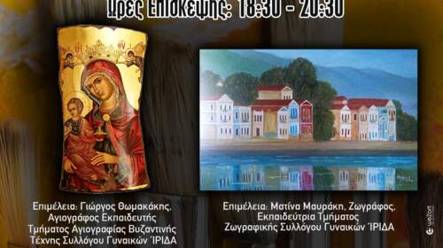 Η Εξέλιξη μέσα από την Πορεία της Τέχνης Τα Τμήματα Ζωγραφικής και Αγιογραφίας Βυζαντινής Τέχνης του Συλλόγου Γυναικών ΊΡΙΔΑ, εκθέτουν τις δημιουργίες τους, της περιόδου 2023 – 2024 , στον χώρο του Dali Art Cafe, στην Ανώπολη Πεδιάδος . Διοργάνωση: Σύλλογος Γυναικών ΊΡΙΔΑ Επιμέλεια: Συντελεστές Έκθεσης: Τμήματος Ζωγραφικής: Θωμακάκη Μαρία Καψετάκη Μαρία Μαραγκάκη Γεωργία Μετοχαράκη Τζαγάκη Όλγα Σιδηροπούλου Έφη Τζαγάκη…