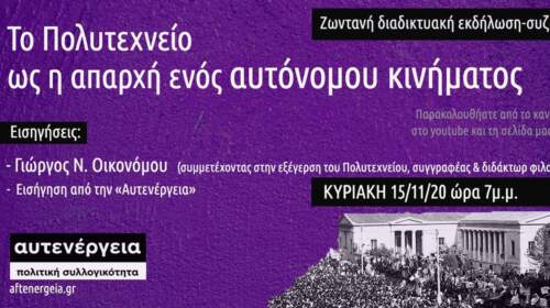Ζωντανή διαδικτυακή εκδήλωση-συζήτηση Ζωντανή διαδικτυακή εκδήλωση-συζήτηση με τίτλο «Το Πολυτεχνείο ως η απαρχή ενός αυτόνομου κινήματος» θα πραγματοποιηθεί την Κυριακή 15/11/20 και ώρα 7μ.μ. Εισηγήσεις:– Γιώργος Ν. Οικονόμου (συμμετέχοντας στην εξέγερση του Πολυτεχνείου, συγγραφέας του «Πολυτεχνείο 1973: Η απαρχή του αυτόνομου κινήματος» & διδάκτωρ φιλοσοφίας)– Εισήγηση από την «Αυτενέργεια» Η ανακοίνωση της διοργάνωσης: Μέσα στην παγωμένη ατμόσφαιρα του lockdown και…