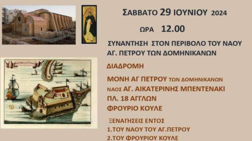Nέα ξενάγηση το Σάββατο 29 Ιουνίου Από το Ναό του Αγίου Πέτρου των Δομηνικανών στις 12:00 το μεσημέρι το Σάββατο 29 Ιουνίου θα ξεκινήσει η ξενάγηση στο Ηράκλειο στα πλαίσια του κύκλου δράσεων «Χαρτοδιαδρομές… στο Δήμο μας» τον οποίο διοργανώνει ο Δήμος Ηρακλείου – Αντιδημαρχία Εθελοντισμού με τη συνεργασία της Εθελοντικής ομάδας Φιλόπολις. Με ξεναγό την Αθηνά Σφακάκη, οι συμμετέχοντες…