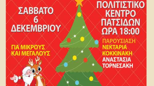 Ο Πολιτιστικός Σύλλογος Πατσίδων σας προσκαλεί στην έναρξη των Χριστουγεννιάτικων εκδηλώσεων στις Πατσίδες! Το Σάββατο 6 Δεκεμβρίου στις 19.00 η Φωταγώγηση του Χριστουγεννιάτικου Δέντρου στο Πολιτιστικό Κέντρο Πατσίδων!! Υποδεχόμαστε από τις 18.00 τον Άγιο Βασίλη με το έλκηθρο και τα Ξωτικά του,τους Ήρωες της Ντίσνευ, ο Stich και η Angel το Ξωτικό των Χριστουγέννων για να γράψουν μαζί με τα…
