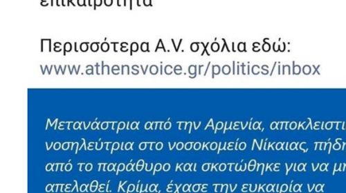 Οργή και σφοδρές αντιδράσεις προκάλεσε ανάρτηση της εφημερίδας Athens Voice με αφορμή τον τραγικό θάνατο της νοσηλεύτριας που πήδηξε από το παράθυρο του Κρατικού Νοσοκομείου στη Νίκαια. Ειδικότερα, η στήλη Inbox της εφημερίδας, έγραψε το εξής: «Μετανάστρια από την Αρμενία, αποκλειστική νοσηλεύτρια στο Νοσοκομείο Νίκαιας πήδηξε από το παράθυρο και σκοτώθηκε για να μην απελαθεί. Κρίμα, έχασε την ευκαιρία να…