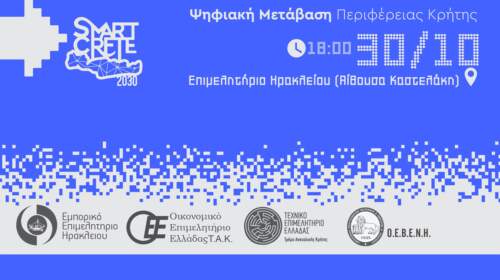 Η Περιφέρεια Κρήτης διοργανώνει ενημερωτική εκδήλωση με θέμα «ψηφιακή μετάβαση Περιφέρειας Κρήτης – Έξυπνη Κρήτη 2030», με τη συνεργασία του Εμπορικού Επιμελητηρίου Ηρακλείου, του Τμήματος Ανατολικής Κρήτης του Οικονομικού Επιμελητηρίου, του Τμήματος Ανατολικής Κρήτης του Τεχνικού Επιμελητηρίου και της Ομοσπονδίας Επαγγελματιών Βιοτεχνών εμπόρων Νομού Ηρακλείου (ΟΕΒΕΝΗ). Η εκδήλωση θα πραγματοποιηθεί την Τετάρτη 30 Οκτωβρίου 2024 και ώρα 6 το απόγευμα…