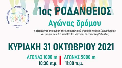 Με τη συνδιοργάνωση της Περιφέρειας Κρήτης, ο Εξωραϊστικός, Αναπτυξιακός & Πολιτιστικός Σύλλογος Προαστίου Αγ. Ιωάννου διοργανώνει τον «1ο Ροδάνθειο Δρόμο 2021», την Κυριακή 31 Οκτωβρίου 2021 στο προάστιο Αγίου Ιωάννου στην Π.Ε Ηρακλείου. Ο δρόμος 1.000μ και δρόμος σε ανώμαλο έδαφος 5.000μ είναι αφιερωμένος στη μνήμη της Σπετσωτάκη Ροδούλας, Εκπαιδευτικού Φυσικής Αγωγής, Διευθύντριας Σχολικών μονάδων και μέλους του Δ.Σ. του…