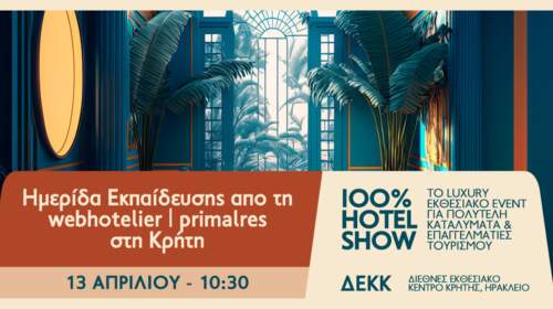 Στο ΔΕΚΚ Ηρακλείου Η webhotelier|primalres διοργανώνει το Σάββατο 13 Απριλίου, για πρώτη φορά στην Κρήτη, μια dedicated ημέρα εκπαίδευσης στις τεχνολογικές λύσεις που παρέχει σε ειδικά διαμορφωμένη αίθουσα στο ΔΕΚΚ Ηρακλείου, στο πλαίσιο του πρώτου 100% Hotel Show στον προορισμό. Η ημερίδα θα διοργανωθεί το Σάββατο 13 Απριλίου και περιλαμβάνει: 10:30 – 13:00 Αύξηση εσόδων μέσω της μηχανής κρατήσεων webhotelier…
