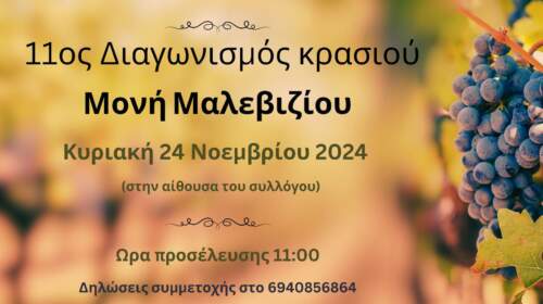 Ο Πολιτιστικός Σύλλογος Μονής σε συνεργασία με το Δήμο Μαλεβιζίου διοργανώνουν και σας προσκαλούν για ενδέκατη χρονιά στο Διαγωνισμό Κρασιού, την Κυριακή 24 Νοεμβρίου 2024 στις 11.00, στην αίθουσα του συλλόγου, στη Μονή Μαλεβιζίου. Δικαίωμα συμμετοχής στο διαγωνισμό έχουν ερασιτέχνες οινοποιοί μόνο για κρασί φετινής σοδειάς. Δηλώσεις συμμετοχής θα γίνονται δεκτές μέχρι και το Σάββατο 23 Νοεμβρίου στις 21.00 και…