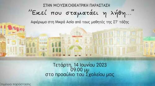 Το 15ο ολοήμερο Δημοτικό σχολείο Ηρακλείου και ο σύλλογος γονέων και κηδεμόνων οργανώνουν διήμερο εορταστικών εκδηλώσεων. Στις 14 Ιουνίου ημέρα Τετάρτη 9:00 το βράδυ στο προαύλιο του σχολείου θα πραγματοποιηθεί η μουσικοθεατρική παράσταση με τίτλο “εκεί που σταματάει η λήθη”. Πρόκειται για ένα αφιέρωμα στη Μικρά Ασία από τους μαθητές της έκτης τάξης. Την παράσταση επιμελούνται οι δάσκαλοι του σχολείου …
