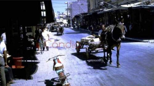 Η φωτογραφία μάς γυρίζει 60 χρόνια πίσω, στο Ηράκλειο του 1964. Είναι καλοκαίρι, όπως βλέπουμε από την αμφίεση των ανθρώπων που κυκλοφορούν στην “Πλατιά Στράτα”, όπως ήταν γνωστή η λεωφόρος Καλοκαιρινού. Τα κάρα σε ρόλο φορτηγών εκείνη την εποχή είναι μέσα στην κυκλοφορία, πλάι στα οχήματα. Βλέπουμε ακόμα και ένα μοτοποδήλατο πλάι στο πεζοδρόμιο. Η φωτογραφία ανήκει στη συλλογή των Μιχάλη…