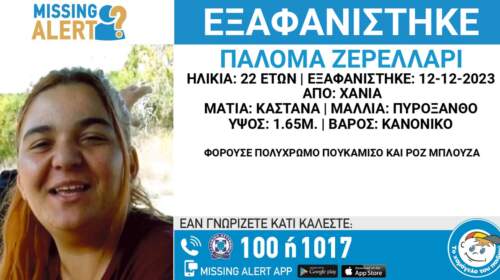 Missing alert για την εξαφάνιση της 22χρονης Ζερελλάρι Παλόμα από τα Χανιά, εξέδωσε το «Χαμόγελο του Παιδιού». Η κοπέλα αγνοείται από τις 12 Δεκεμβρίου, ωστόσο όπως αναφέρει το Χαμόγελο του Παιδιού, ενημερώθηκε χθες για την εξαφάνιση. Η ανακοίνωση από το Χαμόγελο του Παιδιού: Στις 12/12/2023, βραδινές ώρες, εξαφανίστηκε από τα Χανιά Κρήτης, η Ζερελλάρι Παλόμα, 22 ετών. Το «Χαμόγελο του…