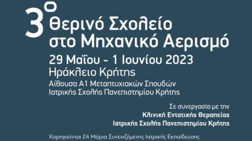 Αίθουσα Α1 Μεταπτυχιακών Σπουδών, Ιατρικής Σχολής Πανεπιστημίου Κρήτης στο Ηράκλειο, από τις 29 Μαΐου έως τη 1 Ιουνίου 2023 Ο στόχος του θερινού σχολείου είναι να βοηθήσει τους γιατρούς να παρέχουν με ασφάλεια και αποτελεσματικότητα μηχανική υποστήριξη της αναπνοής σε βαρέως πάσχοντες ασθενείς. Τα θέματα που θα καλυφθούν περιλαμβάνουν: τη φυσιολογία της αναπνοής που σχετίζεται με τον μηχανικό αερισμό, τις…