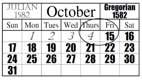 Η 4η Οκτωβρίου 1582 ήταν η τελευταία ημέρα του Ιουλιανού Ημερολογίου. Η αμέσως επόμενη ημέρα και 1η του Γρηγοριανού Ημερολογίου ήταν η 15η Οκτωβρίου. Οι ημέρες από τις 5 Οκτωβρίου έως και τις 14 Οκτωβρίου «δεν υπήρξαν ποτέ», καθώς απαλείφτηκαν, προκειμένου οι ημερομηνίες να εναρμονιστούν με το νέο Γρηγοριανό Ημερολόγιο. Με το Ιουλιανό Ημερολόγιο, η εαρινή ισημερία μετατοπιζόταν κατά μία…