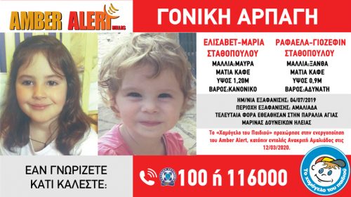 Ανακοίνωση εξέδωσε το Χαμόγελο του Παιδιού για γονική αρπαγή δύο αδελφών στην Αμαλιάδα. Αναλυτικά: Στις 4-7-2019, ο πατέρας των ανήλικων αδερφών Ελισάβετ-Μαρίας και Ραφαέλας-Γιοζεφίν Σταθοπούλου, 9 & 4 ετών αντίστοιχα, προέβη σε αυτοδικία, αρνούμενος να επιστρέψει τις ανήλικες στη μητέρα τους. Το «Χαμόγελο του Παιδιού» προχώρησε στην ενεργοποίηση του Amber Alert σήμερα 13/3/2020, κατόπιν της από 12/3/2020 εντολής Ανακριτή Αμαλιάδας.…