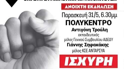 Ανακοίνωση από την ΑΝΤΑΡΣΥΑ ΗΡΑΚΛΕΙΟΥ: Κάτω η κυβέρνηση και η πολιτική της – Με τους εργατικούς αγώνες και δυνατή αντικαπιταλιστική Αριστερά μπορούμε να τους ανατρέψουμε Ομιλητές: ΑΝΤΩΝΙΑ ΑΝΤΩΝΙΟΥ ΝΙΚΟΣ ΖΑΜΠΟΥΛΑΚΗΣ & χαιρετισμοί από υποψηφίους-ες βουλευτές-τριες Το αποτέλεσμα των βουλευτικών εκλογών στις 21 Μάη υπογραμμίζει την ανάγκη για συνέχεια και κλιμάκωση των αγώνων ενάντια στην βάρβαρη πολιτική του κεφαλαίου και την…