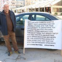 Σε απεργία πείνας προχωρά από σήμερα ένας άνδρας στο Ηράκλειο. Όπως δείχνει φωτογραφία που δημοσίευσε το Image Services, ο άνδρας βρίσκεται στην πλατεία Ελευθερίας, κρατώντας ένα πανό. Στο πανό αναγράφεται: “Ξεκινάω από σήμερα απεργία πείνας διότι διώκομαι εδώ και μερικά χρόνια από τον τάδε. Έχω περάσει τα δικαστήρια του Ηρακλείου και έχω αθωωθεί. Σήμερα ζητάω ακρόαση από τον Εισαγγελέα του…