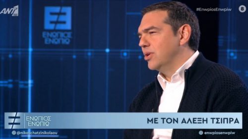 Ο Πρωθυπουργός Αλέξης Τσίπρας “ανοίγει τα χαρτιά του” στο κεντρικό δελτίο ειδήσεων του ΑΝΤ1 με τον Νίκο Χατζηνικολάου, τη Δευτέρα 15/4, στις 19:30 και μιλά για την οικονομία, τα εθνικά θέματα, την υπόθεση Novartis και την Κεντροαριστερά.