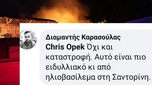 Εγκωμιασμός πιθανής εγκληματικής ενέργειας; Απλή απανθρωπιά; Ακροδεξιά τύφλωση; Ο Διαμαντής Καρασούλας, «τομεάρχης Προστασίας του πολίτη» [!] της ΝΟΔΕ Ηλείας όπως ο ίδιος «συστήνεται», πανηγύρισε δημόσια με σκαιό τρόπο για την πυρκαγιά στη δομή One Happy Family στη Λέσβο το βράδυ του Σαββάτου, και μάλιστα επέμεινε με ακόμη χειρότερους πανηγυρισμούς όταν του επισημάνθηκε η αθλιότητα του αρχικού σχολίου του. Δείτε επίσης: Διεγράφη μετά…