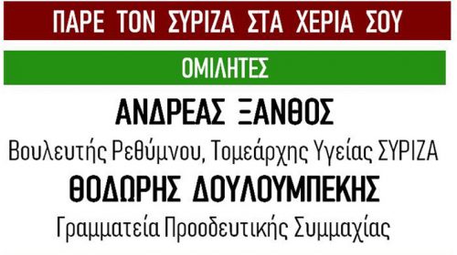 Η Οργάνωση Μελών ΣΥΡΙΖΑ Πόλης Ρεθύμνουπραγματοποιεί την Παρασκευή 4 Οκτωβρίου και ώρα 7:30 μμ στην αίθουσα του Εργατικού Κέντρου Ρεθύμνου ανοιχτή συνέλευση με θέμα συζήτησης: «Κάνουμε δική μας υπόθεση την συγκρότηση της σύγχρονης μεγάλης αριστερής και προοδευτικής παράταξης που θα εκφράζει την μεγάλη προοδευτική πλειοψηφία» Θα μιλήσουν ο Βουλευτής Ρεθύμνου και Τομεάρχης Υγείας του ΣΥΡΙΖΑ Ανδρέας Ξανθός και ο Θοδωρής…
