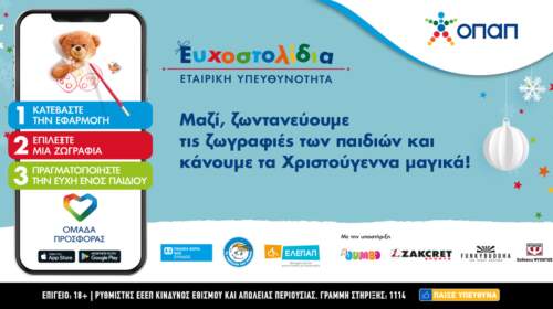 Στηρίζουμε τα παιδιά από «Το Χαμόγελο του Παιδιού», τα Παιδικά Χωριά SOS και την ΕΛΕΠΑΠ και πραγματοποιούμε τις ευχές τους μέσω υπολογιστή, κινητού τηλεφώνου ή tablet Ο ΟΠΑΠ, παραμένοντας ενεργά δίπλα στην ελληνική κοινωνία και στη νέα γενιά, υλοποιεί για έβδομη συνεχή χρονιά την πρωτοβουλία Ευχοστολίδια, ώστε να γίνουν πραγματικότητα οι χριστουγεννιάτικές ευχές χιλιάδων παιδιών που έχουν πραγματική ανάγκη. Στόχος…