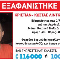 Στον εντοπισμό του 12χρονου Κρίστιαν ο οποίος είχε εξαφανιστεί και βρέθηκε σε σπίτι στην οδό Θηβών προχώρησε η Αστυνομία. Δείτε: Χαμόγελο του παιδιού: Εξαφάνιση 12χρονου Σε ένα σπίτι στην οδό Θηβών εντοπίστηκε το 12χρονο αγόρι που είχε εξαφανιστεί στην περιοχή της Ακρόπολης Ο Κρίστιαν είχε εξαφανιστεί στις 2/7/2018, στις 00:00 π.μ. και το Χαμόγελο του Παιδιού είχε εκδώσει σήμα Amber Alert.