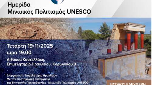 Ημερίδα ” Μινωικός Πολιτισμός UNESCO” στο Επιμελητήριο Ηρακλείου Το Επιμελητήριο Ηρακλείου σας προσκαλεί στην Ημερίδα με θέμα ” Μινωικός Πολιτισμός UNESCO” την Τετάρτη 19/11/2025 και ώρα 19.00 στην αίθουσα Καστελλάκη (Επιμελητήριο Ηρακλείου, Κορωναίου 9). ΕΙΣΟΔΟΣ ΕΛΕΥΘΕΡΗ Πρόγραμμα εκδήλωσης 18:30 – 19:00 Προσέλευση 19:00 – 19:15 Χαιρετισμοί • Βαγγέλης Καρκανάκης, Πρόεδρος Επιμελητηρίου Ηρακλείου 19:15 – 21:00 Ομιλίες • Δημήτρης Παυλόπουλος Μηχανολόγος…