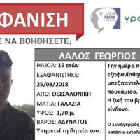Την εξαφάνιση ενός 19χρονου φαντάρου από τη Θεσσαλονίκη γνωστοποίησε η Γραμμή Ζωής. Όπως αναφέρει στη σχετική ανακοίνωση, ο Γιώργος Λάλος αγνοείται από τις 25 Αυγούστου. Ο 19χρονος φαντάρος έχει ύψος 1.70μ., είναι αδύνατος και έχει γαλάζια μάτια.