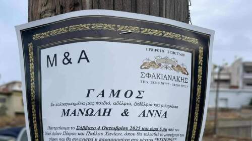 Ανάμεσα στο μακάβρια και το χιουμοριστική, κατατάσσεται η ιδέα ενός ιδιοκτήτη γραφείου τελετών στα Χανιά, να αναγγείλει τον γάμο του γιου του… με κηδειόχαρτο! Στο αγγελτήριο του γάμου ενημερώνει ότι η τελετή θα πραγματοποιηθεί στον ιερό ναό Πέτρου και Παύλου στα Χανιά το απόγευμα, προαναγγέλοντας παράλληλα «συνέχεια της παραφροσύνης», όπως αναφέρεται χαρακτηριστικά σε νυχτερινό κέντρο. Ο συγκεκριμένος ιδιοκτήτης γραφείου τελετών…