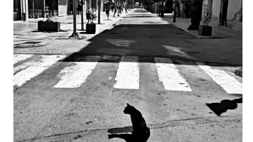 Μιά μαύρη γάτα μόνη, δείχνει να απολαμβάνει την ανοιξιάτικη λιακάδα, σ’ ένα έρημο αστικό τοπίο, και να απορεί: Αλήθεια, πού πήγαν οι άνθρωποι; Κωνσταντίνος Καζανάκης