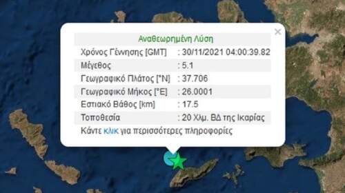 Ισχυρός σεισμός σημειώθηκε το πρωί της Τρίτης 30 Νοεμβρίου στην Ικαρία. Η δόνηση είχε μέγεθος 5,1 Ρίχτερ και σημειώθηκε 20 χλμ Βορειοδυτικά της Ικαρίας. Σύμφωνα με την αυτόματη λύση του Γεωδυναμικού Ινστιτούτου Αθηνών, το εστιακό βάθος υπολογίζεται στα 17,5 χλμ. Εννέα λεπτά μετά τον ισχυρό σεισμό των 5,1 Ρίχτερ οι σεισμογράφοι κατέγραψαν και έναν μετασεισμό μεγέθους 4,1 Ρίχτερ με το…