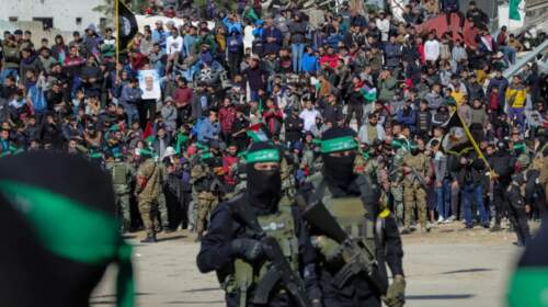 Η Χαμάς άφησε ελεύθερες σήμερα τέσσερις στρατιωτίνες του Ισραήλ, ομήρους στη Λωρίδα της Γάζας από την 7η Οκτωβρίου 2023, με αντάλλαγμα την αποφυλάκιση δεκάδων Παλαιστινίων που κρατούνται στο Ισραήλ· πρόκειται για τη δεύτερη ανταλλαγή αυτής της φύσης που προβλέπεται βάσει της συμφωνίας κατάπαυσης του πυρός στη Λωρίδα της Γάζας. Καθώς η πλατεία Παλαιστίνης είναι γεμάτη από πλήθος και μαχητές της…