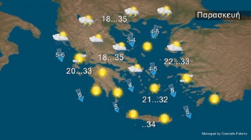 Σχεδόν αίθριος θα κυλήσει ο καιρός την Παρασκευή στα νότια αλλά στα υπόλοιπα κεντρικά και βόρεια ηπειρωτικά θα εκδηλωθούν τοπικοί όμβροι και σποραδικές καταιγίδες που τις βραδινές ώρες θα περιοριστούν στα βορειοανατολικά. Τα φαινόμενα θα είναι κατά τόπους ισχυρά στα βορειοανατολικά. Στην υπόλοιπη χώρα τοπικοί όμβροι ή μεμονωμένες καταιγίδες κυρίως τις απογευματινές ώρες στα ηπειρωτικά. Από πλευράς επικινδυνότητας πυρκαγιών την…