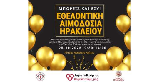 Το Σάββατο 25 Οκτωβρίου 2025 θα πραγματοποιηθεί εθελοντική αιμοδοσία στο κέντρο της πόλης του Ηρακλείου και συγκεκριμένα στο αίθριο της Λότζια από τις 09:30 έως τις 14:00. Η εθελοντική αιμοδοσία πραγματοποιείται κάθε Σάββατο. Πρόκειται για μια κοινή προσπάθεια αιμοδοσίας, την οποία διοργανώνει ο Παγκρήτιος Σύνδεσμος Εθελοντών Αιμοδοτών και Δωρητών Οργάνων Σώματος «Αιματοκρήτης» με τη στήριξη του Δήμου Ηρακλείου. Σε αυτή…
