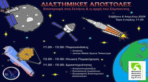Το Σάββατο 6 Απριλίου, σας περιμένουμε στο Μουσείο Φυσικής Ιστορίας Κρήτης-Πανεπιστήμιο Κρήτης, σε μια εκδήλωση αφιερωμένη σε διαστημικές αποστολές! Στις 11π.μ. θα μιλήσουμε για την αποστολή Artemis, με την οποία η ανθρωπότητα θα ξαναπατήσει στη Σελήνη , καθώς και για το James Webb Space Telescope, του οποίου σκοπός είναι να ανακαλύψει τα μυστικά της απαρχής του σύμπαντος. Θα ακολουθήσει Ηλιακή παρατήρηση* *στην περίπτωση που ο καιρός δεν το…