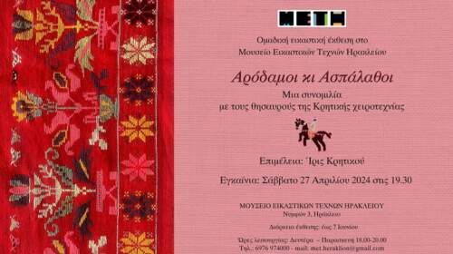 Εγκαινιάζεται το Σάββατο 27 Απριλίου 2024 στις 19:30 στο Μουσείο Εικαστικών Τεχνών Ηρακλείου, η ομαδική εικαστική έκθεση με τίτλο «Αροδαμοί κι ασπάλαθοι, μια συνομιλία με τους θησαυρούς της Κρητικής χειροτεχνίας», με την επιμέλεια της Ίριδας Κρητικού. Η έκθεση θα διαρκέσει έως τις 7 Ιουνίου, με ωράριο λειτουργίας από Δευτέρα ως Παρασκευή, 18:00 – 20:00.