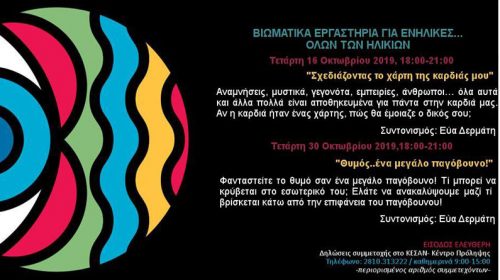 Βιωματικά εργαστήρια για μικρούς και μεγάλους μαζί, γονείς και ενήλικες διοργανώνει το μήνα Οκτώβριο 2019 το ΚΕΣΑΝ – Κέντρο Πρόληψης των Εξαρτήσεων και Προαγωγής της Ψυχοκοινωνικής Υγείας Δήμου Ηρακλείου, στο πλαίσιο του MOVERE: ένα πρόγραμμα για τα συναισθήματα για μικρούς και μεγάλους. Το MOVERE σχεδιάστηκε από την επιστημονική ομάδα του ΚΕΣΑΝ – Κέντρου Πρόληψης και υλοποιείται σε συνεργασία με την Αντιδημαρχία Παιδείας,…