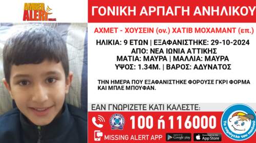 Συναγερμός έχει σημάνει στις Αρχές καθώς στις 9.00 το πρωί της Τρίτης (29/10), ο πατέρας του 9χρονου Αχμέτ-Χουσεΐν Χατίβ Μοχάμαντ, με καταγωγή από τη Συρία, σύμφωνα με την ΕΛ.ΑΣ, προέβη σε αρπαγή του ανήλικου από την περιοχή της Νέας Ιωνίας και έκτοτε αγνοείται. «Το Χαμόγελο του Παιδιού» ενημερώθηκε και προχώρησε στην ενεργοποίηση του μηχανισμού AMBER ALERT HELLAS κατόπιν εισαγγελικής εντολής,…